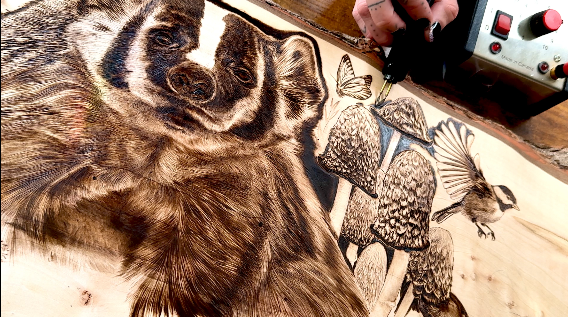 A detailed woodburning artwork of a badger, with additional images of mushrooms, a butterfly, and a bird, in progress on a wooden maple surface.