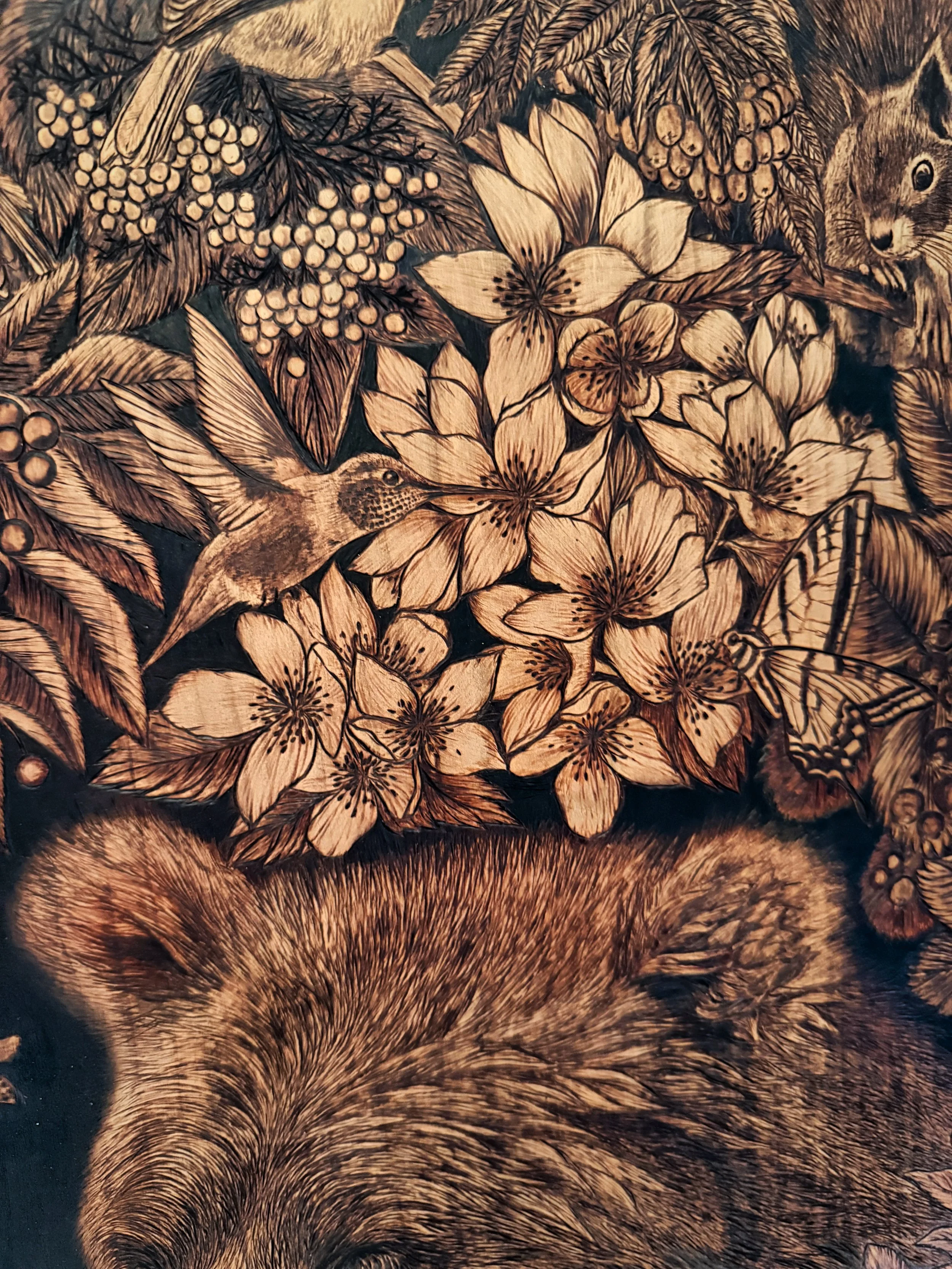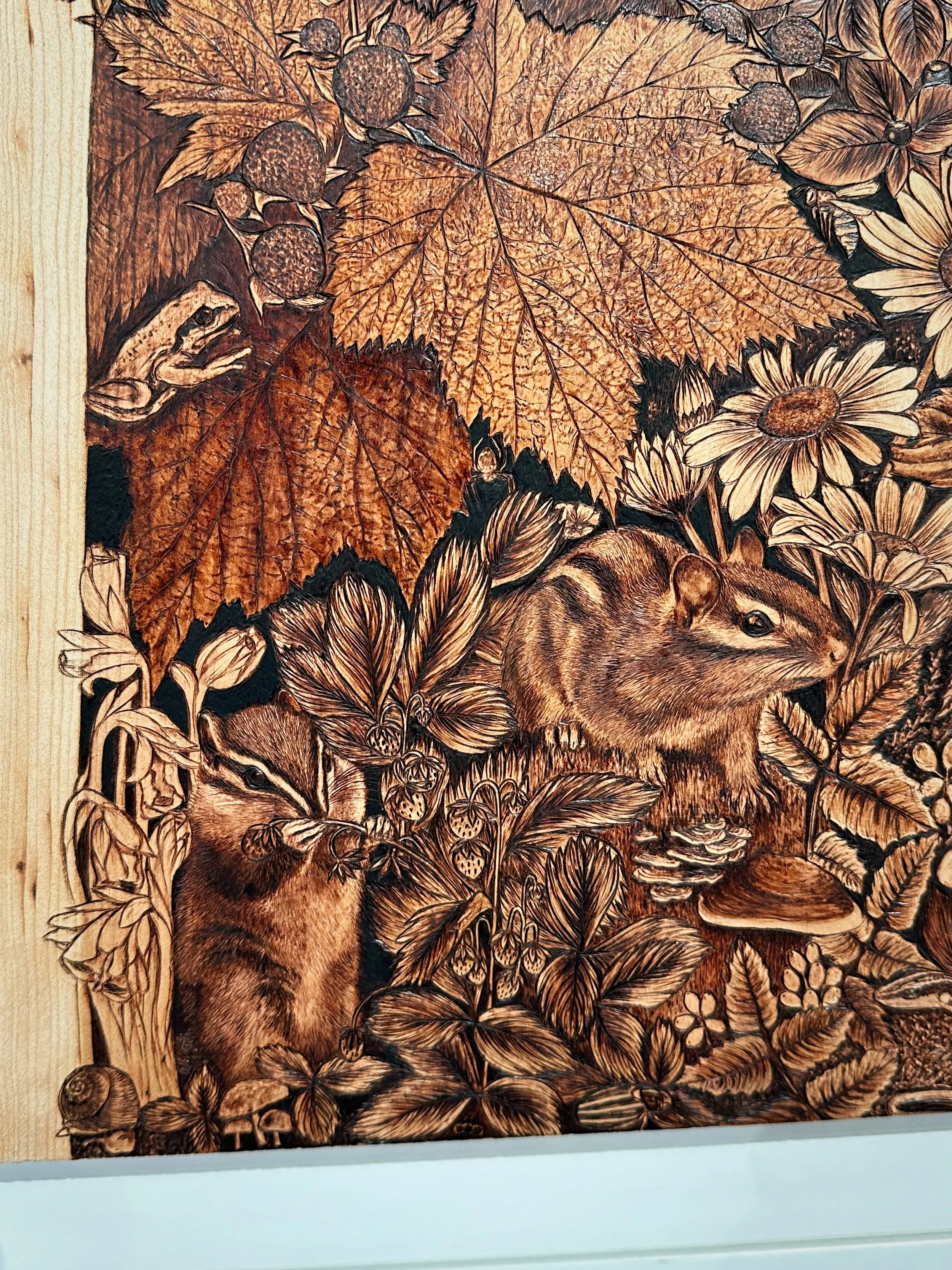This piece is expertly textured: giving depth and realistic details, and no coloured mediums have been used; the different shades have been accomplished by burning and sanding the piece only. The piece seems to transform throughout the day, highlighting new details or creating shadowy depth as the natural light moves across the room and across the textures.