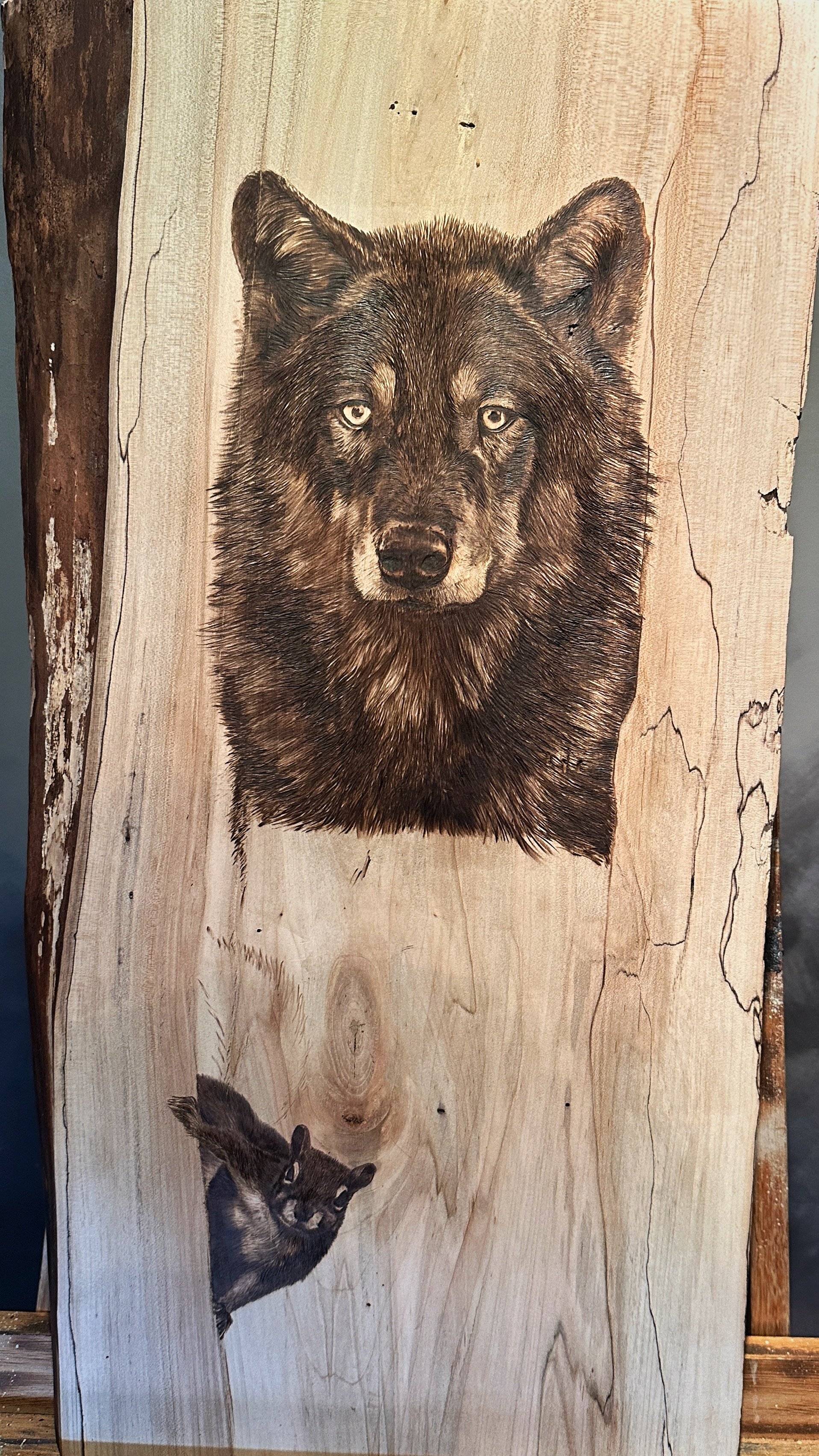 The inspiration for this piece came from the wood itself; the patterns from the spalted maple reminded me of dead trees still standing with the bark still cliunging to the dead trunks. I wanted to honour the piece and the natural patterns of the grains and markings, and incorporate them in as part of the final vision.